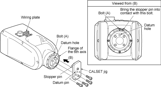 The CALSET position of the 6th axis refers to the point where the stopper pin (shown in the figure below) comes into contact with bolt (A) by turning the flange of the 6th axis.