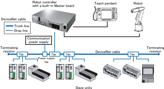 A DeviceNet network has two kinds of nodes: slaves to which external I/Os are connected, and a master that controls these slaves. Note that their addresses are just network settings, so the master and slaves can be freely arranged on physical sites.