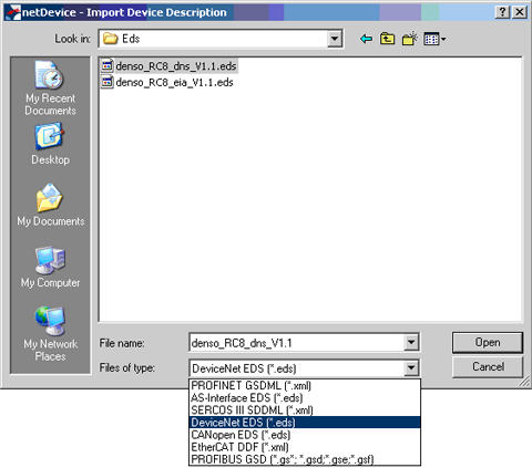 Select [DeviceNet EDS (*.eds)] from the dropdown list of the file type, and then import EDS file from the connected DeviceNet slave devices. Execute this process for each model of slave devices.