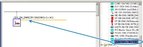 Master board CIFX DN/DNM, which has been set in STEP3, is displayed as shown below. From the tree in the right side of the display, click [DeviceNet]-[Slave] and then select desired slave device. Move the slave device to the horizontal yellow line on the center of the window, which comes from the master board icon, using a drag-and-drop operation.