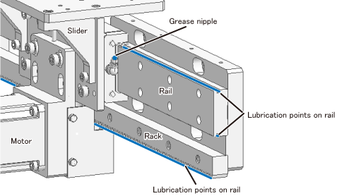 Check that there are no oil drops from the lubrication points. Improper environment, amount of grease, or lubrication procedure may cause oil drops.