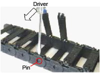 Insert a flat-blade screwdriver into a gap between links as shown in the figure below, pull the screwdriver toward yourself, and remove the pin from the hole.