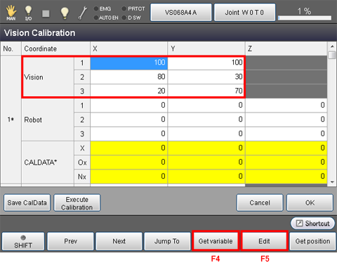 Select a cell that you intend to enter a value, and then press [F6 Get position] to display a confirmation dialog box. Press [OK] on the dialog box. The value of X-, Y- and Z-coordinate of the current robot position will be copied to each cell on the Vision Calibration window.