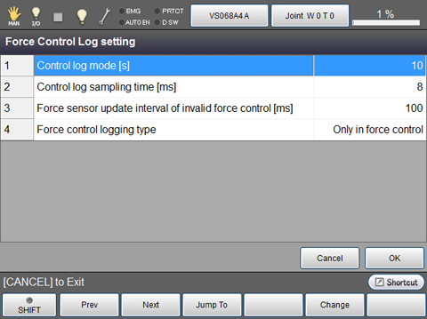 Changed value or item are confirmed by pressing [OK] button on the [Force Control Log setting] window.