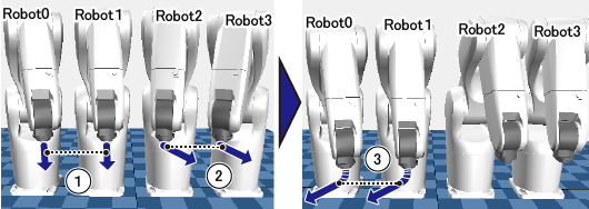 To move the first motion (performed by Robot0 and Robot1) with the Next option, move the second motion (performed by Robot2 and Robot3) with the Next option, and then start the third motion (performed by Robot0 and Robot1) with the pass motion. (The robot combination before and after the pass motion is the same.)