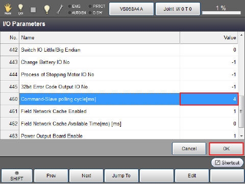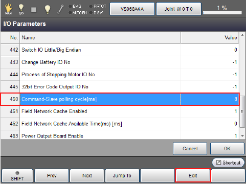 On the [I/O Parameters] window, select [460: Command-Slave polling cycle [ms]], and then press [F5 Edit].