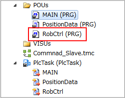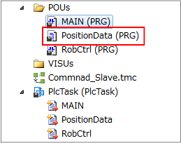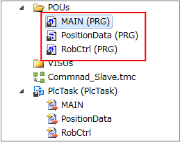 In the [POUs] folder, create [(MAIN)main program], [(PositionData)position data program] and [(RobCtrl)robot control program].