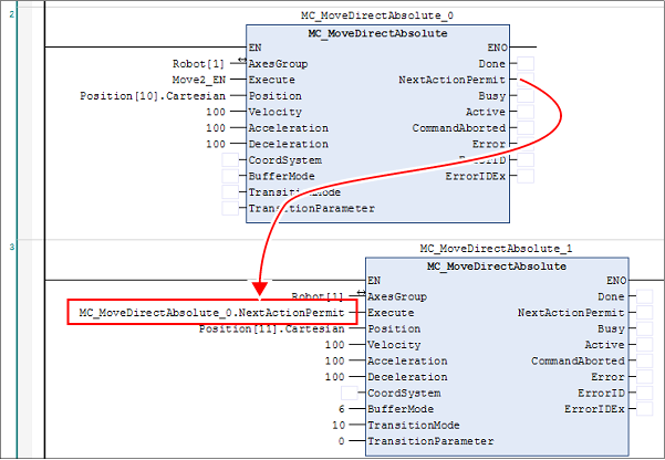 As the following shows, specifying the output variable "NextActionPermit" to the next FB's input variable "Execute" will enables a robot to move these FBs in sequence.