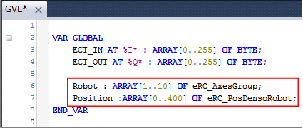 In the [GVLs] folder, in the global variable lists, create "eRC_AxesGroup" type and "eRC_PosDensoRobot" type variables.