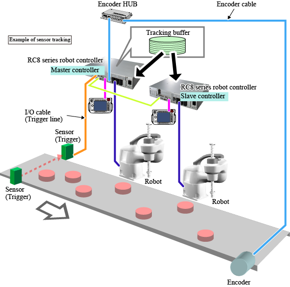 Tracking buffer data is shared by the master and slave controllers to achieve conveyor tracking with two robots operation.