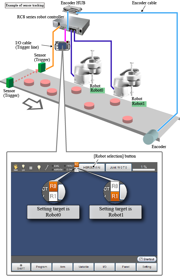 For the encoder setting and trigger setting, use a teach pendant. If the dual arm control function is used, only one teach pendant is connected. Therefore, at the configuration, you need to specify which robot (Robot0 or Robot1) is configured.