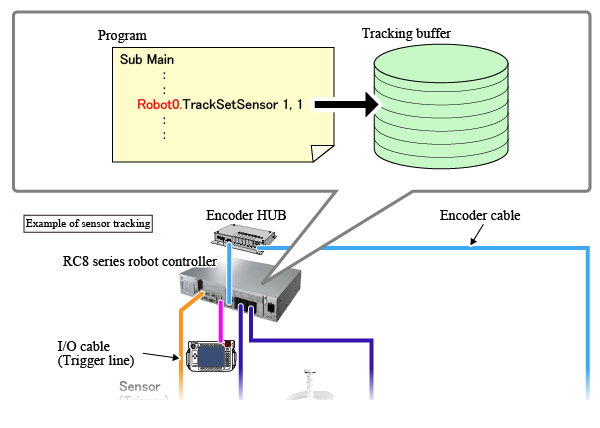 Other than the motor setting, encoder joint number, trigger setting, data registration to the tracking buffer for the conveyor must be clearly specified with the target robot number.