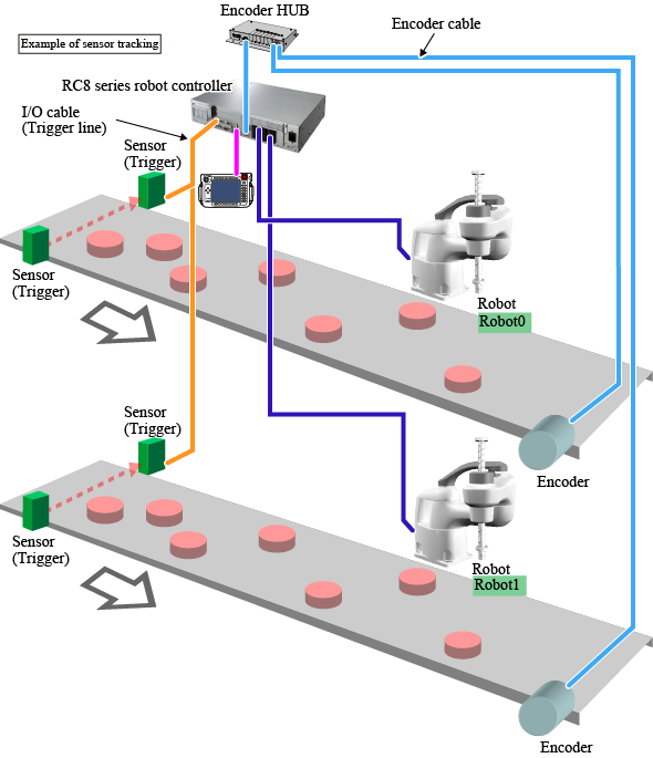 When the dual arm control function is used, if two robots perform conveyor tracking operation on the different conveyor, the two robots do not need to share the encoder and triggers. Therefore, set both Robot0 and Robot1 as a master. (Each robot has no slave robot.) Encoder setting, trigger setting, and the tracking buffer data registration must be done for Robot0 and Robot1 respectively.