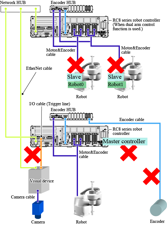 When the dual arm control function is used, the system uses one robot controller only. Therefore, the roles of master and slave are assigned to each robot.