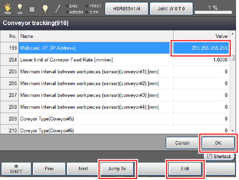 From the [Conveyor tracking] window, select [Multicast. I/F [IP Address]]. Parameter number of [Multicast. I/F [IP Address]] is 199. Press [F3 Jump To], enter "199" to select [Multicast. I/F [IP Address]] directly.