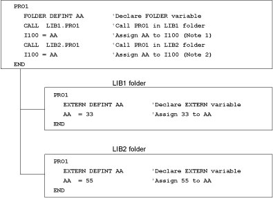 List 3(PRO1 and PRO2 are in different folders)DescriptionPRO1FOLDER DEFINT AAENDList 3 is correct in defining FOLDER variables AA. These variables have the same name but are defined in different folders so that they are treated as different ones.PRO2FOLDER DEFINT AAEND