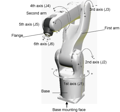 The figures below show the names of the components of the robot unit and the rotation direction of each axis.
