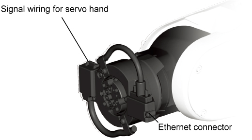 The flange has connectors for signal wiring and Ethernet (1000 BASE-T) interface. Connect them to the CN24 and Ethernet connectors on the connector panel at the robot base.