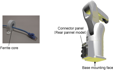 When using an Ethernet cable, install the ferrite core as close as possible to the connector panel, and then secure it with one of the tie bands provided. For the bottom connector panel model, the connector panel locates on the base mounting face.