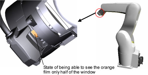 Turn the 6th axis until being able to see the orange film from a half of the window next to the flange. In case of not being able to see the orange film from the window next to the flange at all, turn the 6th axis to the negative direction (clockwise from the front of the flange). In case of being able to see the orange film from the entire window, turn the 6th axis to the positive direction (anti-clockwise).