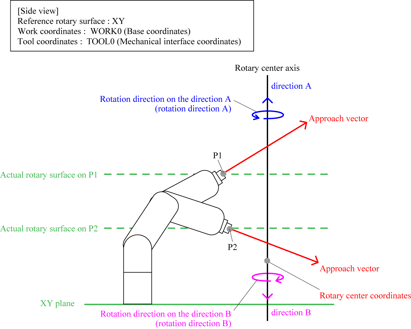 If the approach vector on the current position is horizontal to the actual rotary surface, it is impossible to determine the rotation direction. As a result, a robot may move in different direction even if the same motion is performed. In that case, change the current position and/or the condition of the actual rotary surface, or enable static. When "static = [Enable]" is specified, the vector direction of the rotary center axis is determined regardless of the direction of the approach vector. For details, refer to the following explanation.