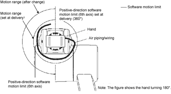 If the robot interferes with any other device, change the software motion limits to make the motion space smaller as shown by the upper figure on this page. If the air piping or wiring of the end-effector becomes taut as the robot runs, change the software motion limits to make the motion space smaller as shown by the lower figure on this page.