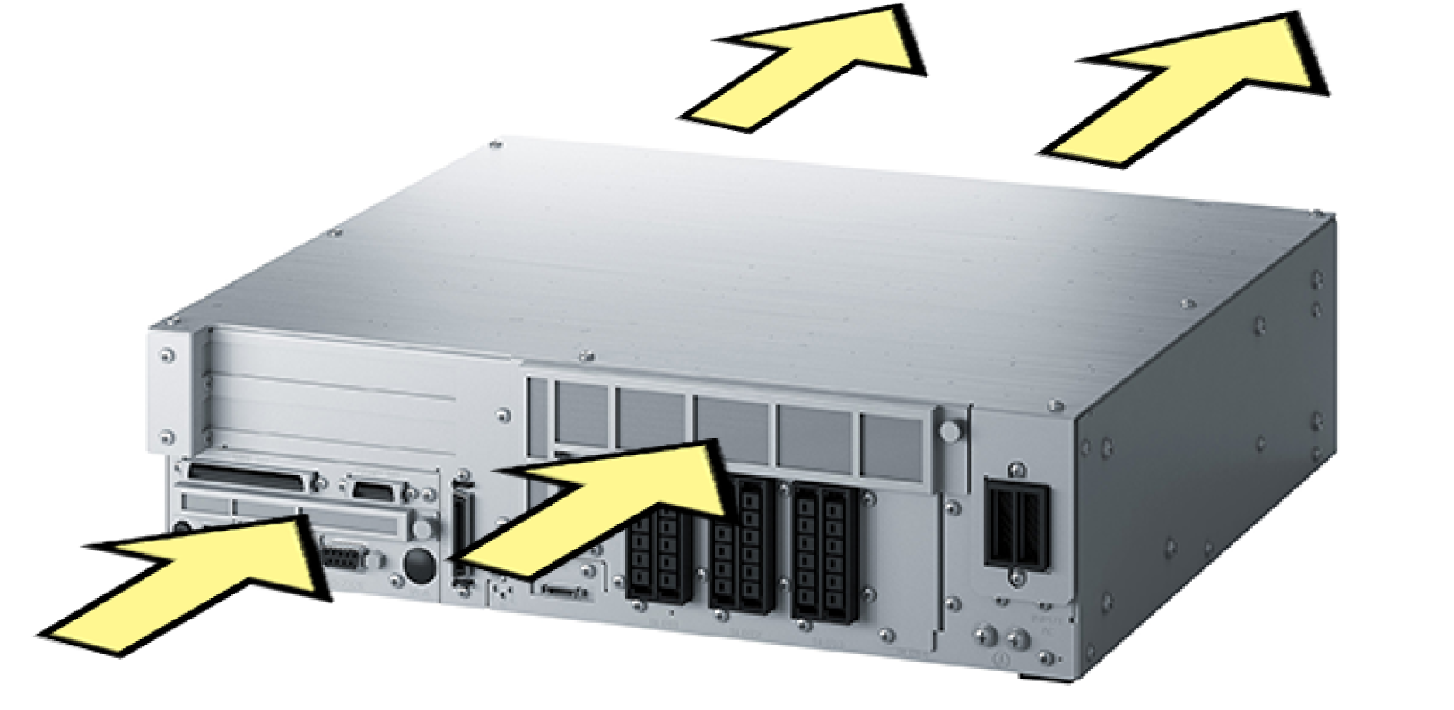 | Cooling fan in the robot controller | Hold up a hand to the exhaust port and check the wind is blowing off. | Should work properly. | Repair or replace. |