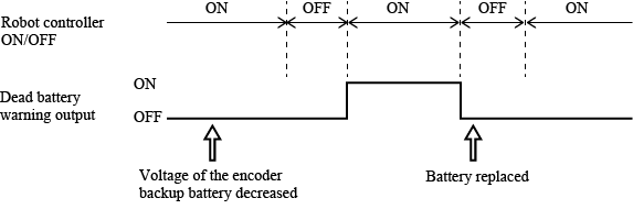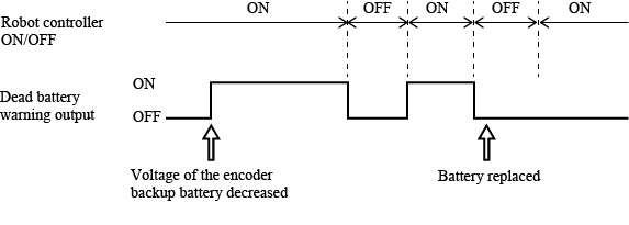 - The signal will remain off if the encoder backup battery voltage does not decrease while the robot controller is on.