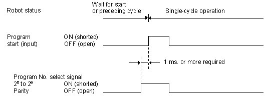 - As shown below "Timing chart", input the program No. select signal before the program start signal (1 msec. or more), and hold the state until the robot starts to operate. If this condition is not met, an error will be displayed, the power to the motor will be turned OFF.