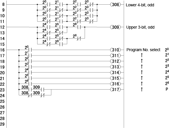 Example: When the program number is 15, the bit status of 20 to 26 is (001111), and the total number of 1s is four, an even number. Set 1 as the parity bit to make the total number of 1s five, an odd number.