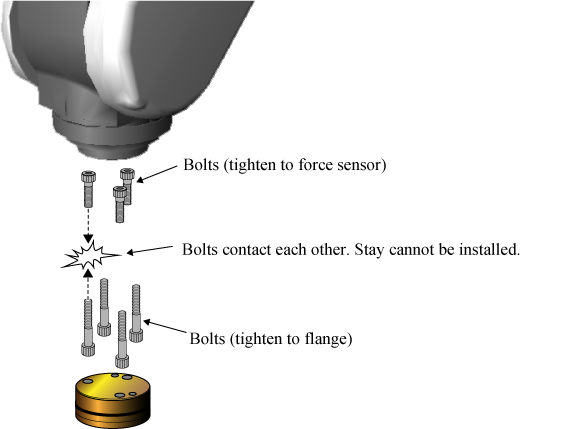 If positions of the screw holes of the flange and the force sensor are close (example: a pitch circle diameter (hereafter, "P.C.D.") of the screw hole of the flange and P.C.D.of the screw hole of the force sensor are very close), both bolts interferes each other as shown below. The standard stay cannot be installed. In this case, install the relay stay additionally.