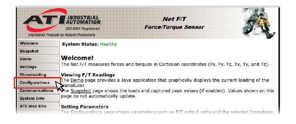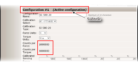 Once the window is updated, confirm that the values are "1000000" for [Counts per Force] and [Counts per Torque] in the subtitle [Configuration #1 (Active configuration)].