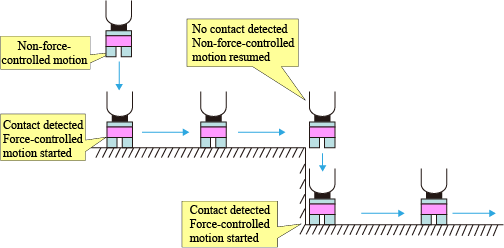 Activating Force Sensor Robust Compliance Control will cause the robot to perform a non-force-controlled motion until a contact with an object is detected from the output values of the sensor.