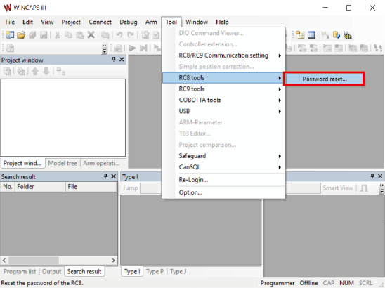 Press [Password reset] from [RC8 tools] in the [Tool] menu.