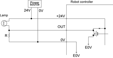 Keep the current consumption of a device to be connected to the Robot Controller, such as a PLC and a relay coil, below the allowable current. - Select an induction load, such as a relay coil, which has a built-in diode (for absorbing inverse electromotive force).