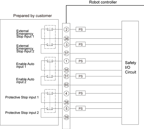 - Two Protective Stop input signals and two Enable Auto input signals each must be controlled with separate contacts. Two circuits connected in parallel using a single contact or an always-shorted circuit will be interpreted as an external circuit failure so that the circuitry will not operate.