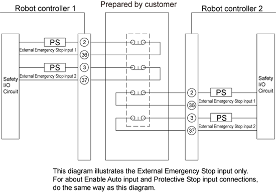 If you use two or more controllers, the External emergency stop input of each controller must be controlled at the separate points. If these are connected to the same line, it may damage the controllers. Please refer to the following connection diagrams.