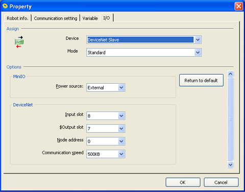 From the [Project] menu, point to [Property] to open the Property window, and then click .[I/O] tab. For details, refer to "Configuring a Project".