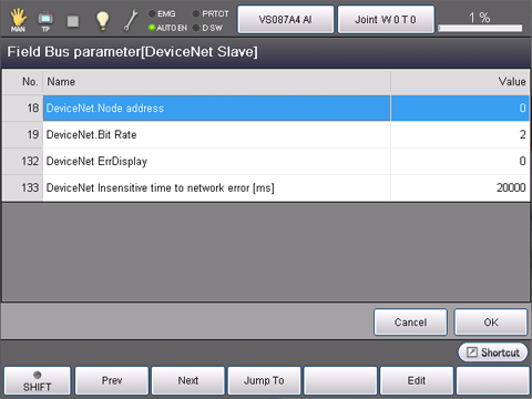 From the top screen—[F4 I/O]—[F6 Aux.]-[F4 Field Bus parameter]