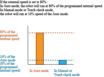 - Actual robot moves at [internal speed x external speed (%)] when in Auto mode. For example, if the external speed is set at 80%, the robot moves at internal speed x 80%.