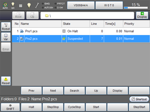 Press [F1 Halt] in the program list display window or [STOP] button on the teach pendant.