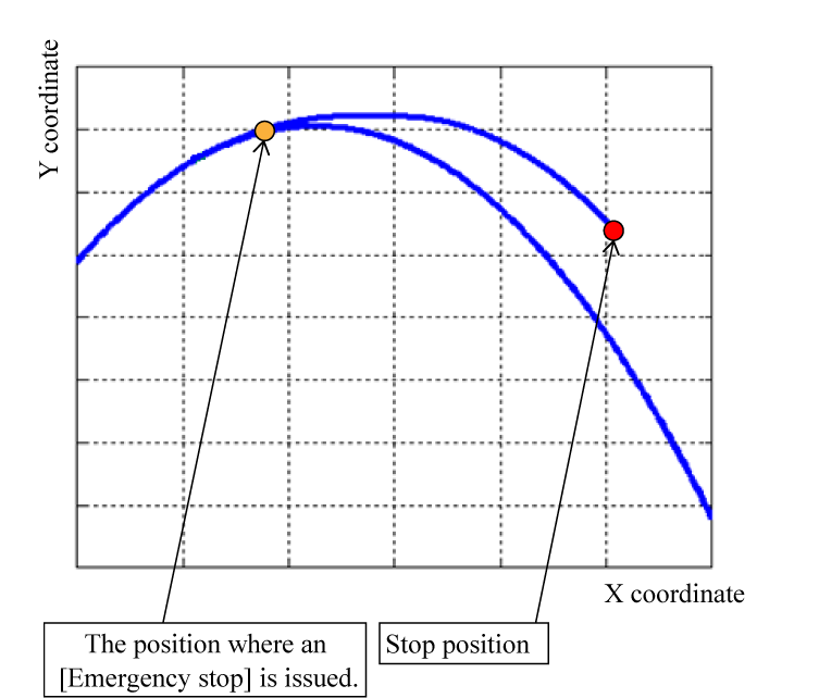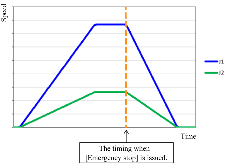 If your controller is version 2.1.* or higher, you can select the stop process for the version 2.0.* or before as well. To do so, set the VRC parameter [48 : Stop process of robots at the emergency stop] to [0 : Stop at the axis maximum deceleration]. Please set the user level to [Maintainer] before the change.
