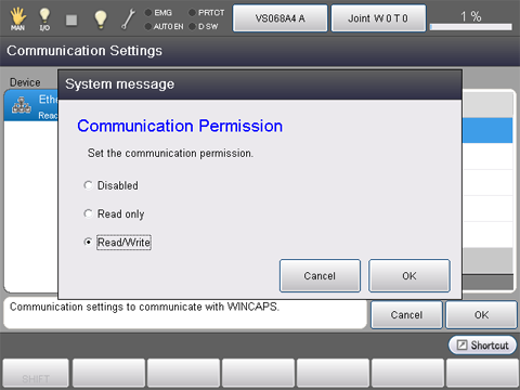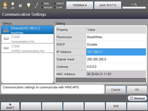 Set robot controller to enable the communication between PC (WINCAPSIII) and robot controller through the Ethernet.This setting is done by teach pendant.