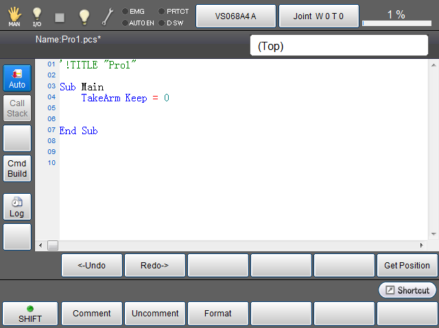 | Cmd Build | With this function, some commands are automatically entered. You can enter necessary parameters at a time. This item is available in Auto mode. | Log |