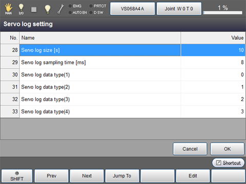 Operation path : [F2 Arm] - [F3 Servo State] - [Servo log tab] - [F6 Setting]