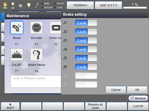 To unlock/lock brakes only for some joints, select unlock or lock by directly touching the Lock/Free display of corresponding joints on the teach pendant.