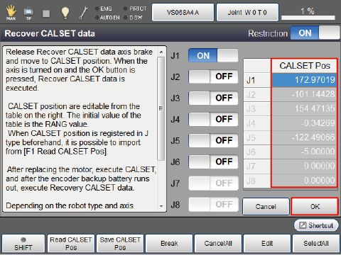 Change all joints to "CALSET (ON)". Change it ON, and press [OK] to restore CALSET data. |
