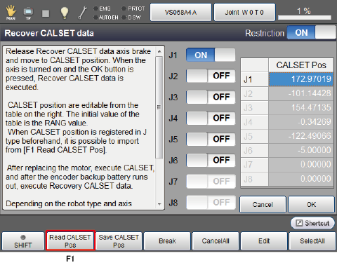 | [F4 Cancel All] | Change all joints to "No CALSET (OFF)". |