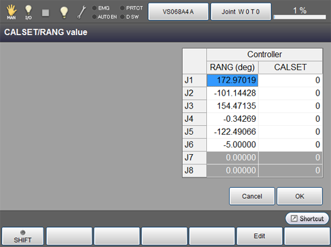 Select the item to change the value by using up, down, left and right cursor keys and jog dial on the teach pendant, and press [Edit] to display numeric keypad. The selected item will be highlighted. |