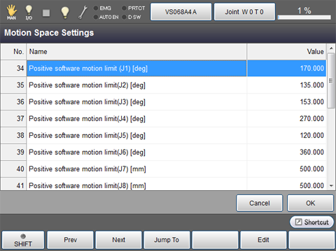 Select the software motion limit of the joint to change, and press [Edit] to display numeric keypad. |